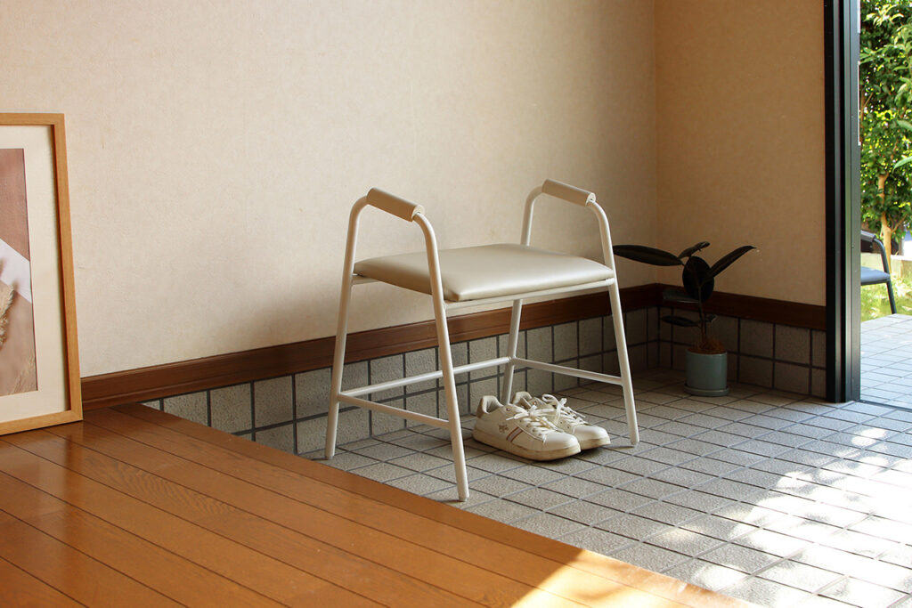 玄関の段差を利用したベンチで、屈んで行う靴の脱ぎ履きにストレスを覚える歳になっても、毎日の外出を楽しくしてくれるアイテムです。ハンドルがあることで安定した動きをサポートしてくれます。